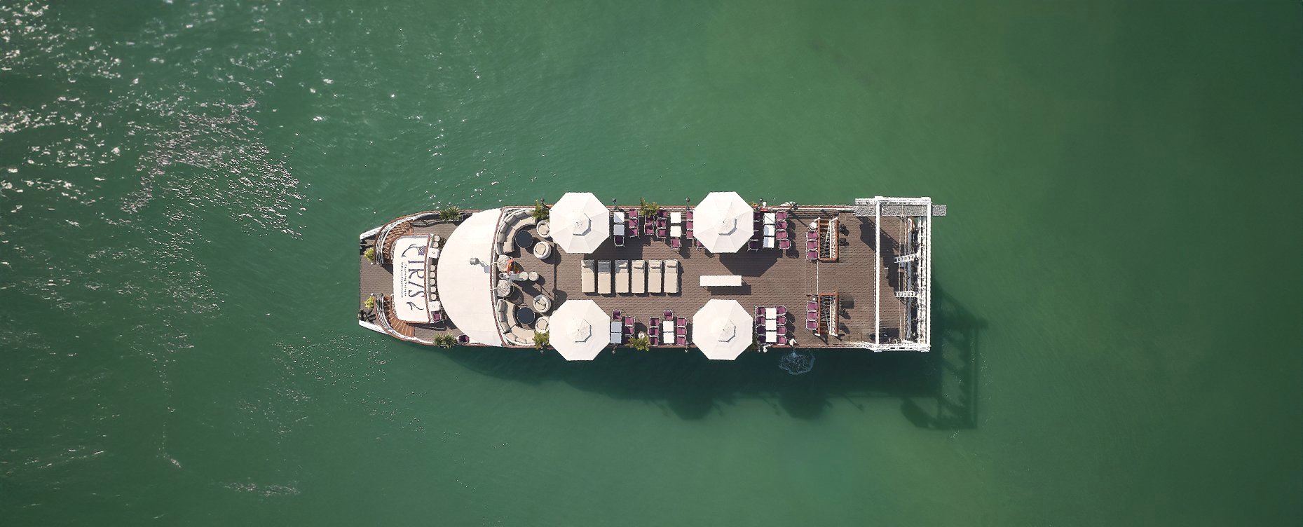 Sundeck rộng lên đến gần 300M2 mặt sàn. Xe điện đưa đón 2 chiều từ Cảng ra du thuyền. Sân khấu và hệ thống âm thanh ánh sáng chuẩn Quốc tế. Ban nhạc sống. Đại tiệc Canapé thượng hạng. Với 02 nhà hàng, tầng 01 tới 70 khách, tầng 2 với Piano band tới 40 khách. Quý khách sẽ được thưởng thức ẩm thực hấp dẫn tại những bữa tiệc buffet mở. Ngâm mình trong làn nước ấm trong khi ngắm nhìn toàn cảnh vịnh từ bể sục hoặc đắm mình trong những hoạt động văn hóa khó quên trong đêm đầy sao. Buffet quốc tế thượng hạng hoặc set menu đẳng cấp. Hải trình tham quan Hang Sửng sốt, đảo Titop, hang Luồn, chèo Kayak hoặc đò chèo tay.