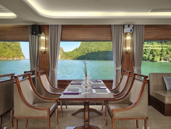 11:30 – 13:00 Đoàn dùng buffet trưa thượng hạng với hải sản Hạ long, cá Hồi, cá Ngừ, cá Trích và đặc biệt món Sườn nướng ngũ vị trứ danh chỉ có trên du thuyền Iris Cruise (*Set menu sẽ phục vụ khi dưới 30 khách). Phụ thu cho menu Tôm Hùm 450,000 VND cho ½ con và cần đặt trước.