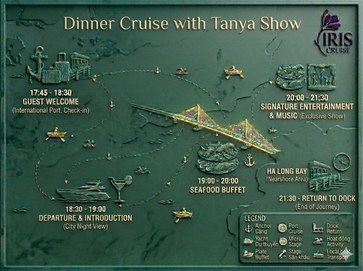 Discover an extraordinary Ha Long Bay dinner cruise on the Iris 'floating theater'. Awaken your senses with gourmet dining in the nighttime heritage bay, and feel the explosive energy of the Tanya Show