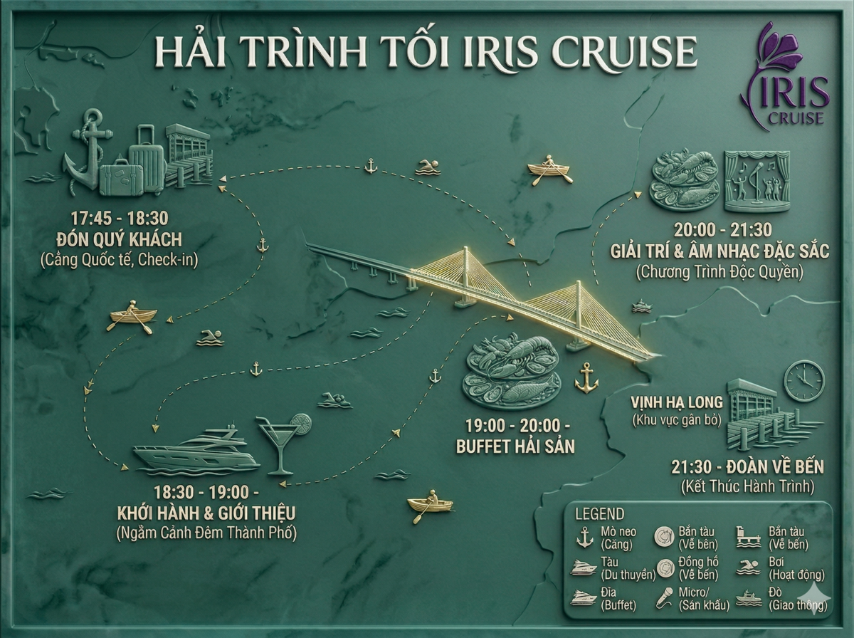 Tự hào là "nhà hát nổi" giữa kỳ quan thiên nhiên thế giới, Iris mang đến hải trình du thuyền tiệc tối Vịnh Hạ Long đẳng cấp và hoàn toàn khác biệt. Chuyến đi đưa du khách thưởng ngoạn vẻ đẹp huyền bí của vịnh di sản về đêm, nuông chiều vị giác với ẩm thực thượng hạng và thăng hoa cảm xúc trong những bữa tiệc âm nhạc xa hoa.